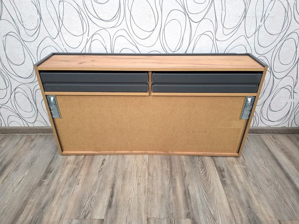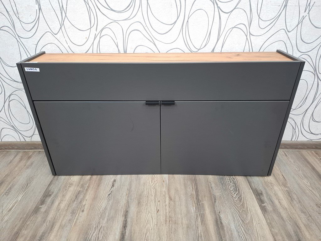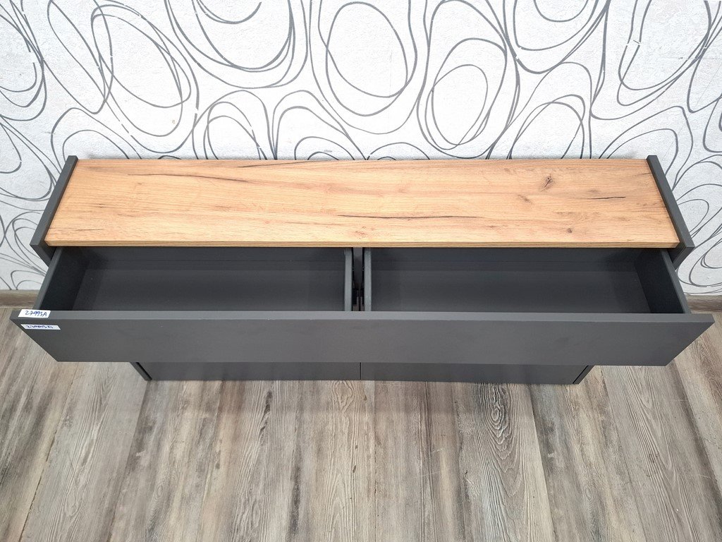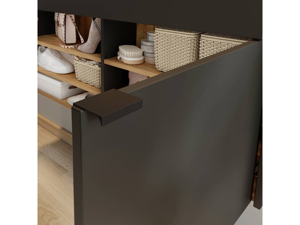 Botník Ameca 110 cm, Materiál: Potahovaná dřevotříska. Barva: grafit/dekor dub Navarra. Rozměry: 110 x 57 x 22 cm (ŠxVxH), váha 24 kg. Vnitřní rozměry zásuvek: 49,8 x 8,6 x 18,6 cm (Š x V x H). Nosnost polic 5 kg. Prodáváme tak, jak vidíte na obrázcích. Případné dekorace nejsou součástí prodeje. Úvodní obrázek je pouze pro ilustraci.