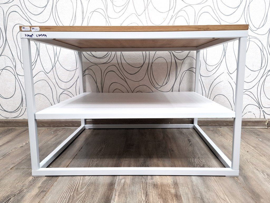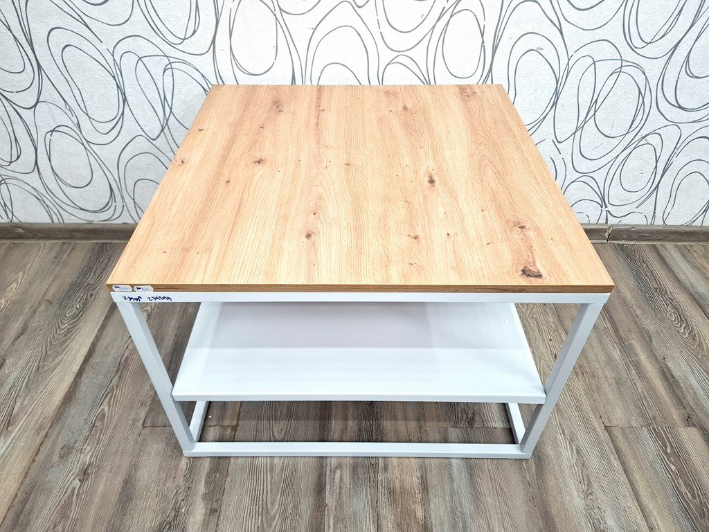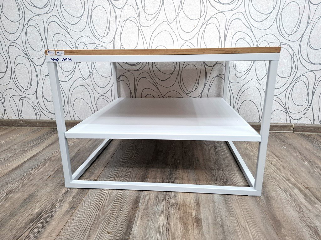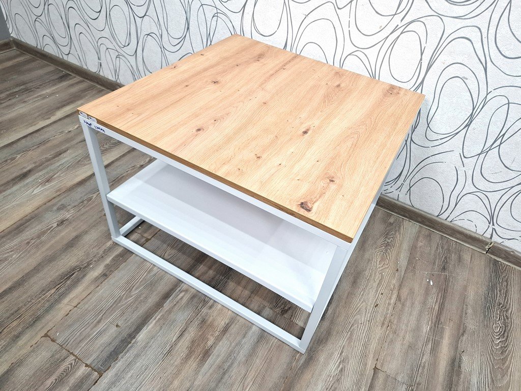Konferenční stolek s ocelovým rámem a policí BADER art. č. 140013.Materiál: MDF, potažená fólii/kov s práškovým nástřikem. Barva: světlý dub/bílá konstrukce. Rozměry: 70 x 70 x 48 cm (ŠxHxV). Váha cca 15 kg. Nosnost max. 30 kg, nosnost spodní police 5 kg. Prodáváme tak, jak vidíte na obrázcích. Případné dekorace a ostatní nábytek slouží jen pro ilustraci.
