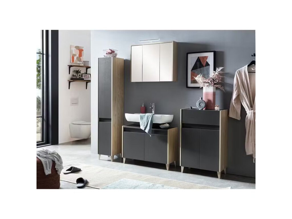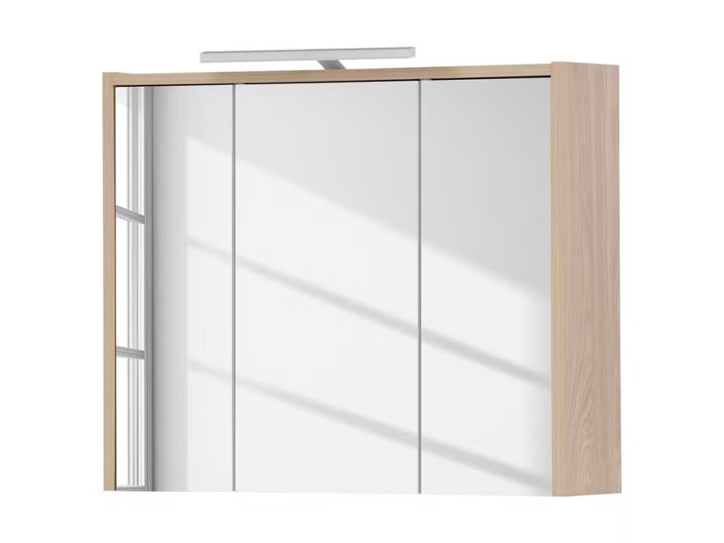 Koupelnová skříňka Elba, art. č. 1000335861, závěsná, se zrcadly a LED osvětlením. Materiál: dřevotříska, potažená, zrcadlové sklo. Barva: dekor světlý dub. Rozměry: 75 x 16 x 60 cm (ŠxHxV). Váha 16 kg. Uvnitř skříňky 3x 2 poličky, včetně LED osvětlení a vypínače/zásuvkového prvku. Prodáváme tak, jak vidíte na obrázcích. Případné doplňky jsou pouze pro ilustraci.