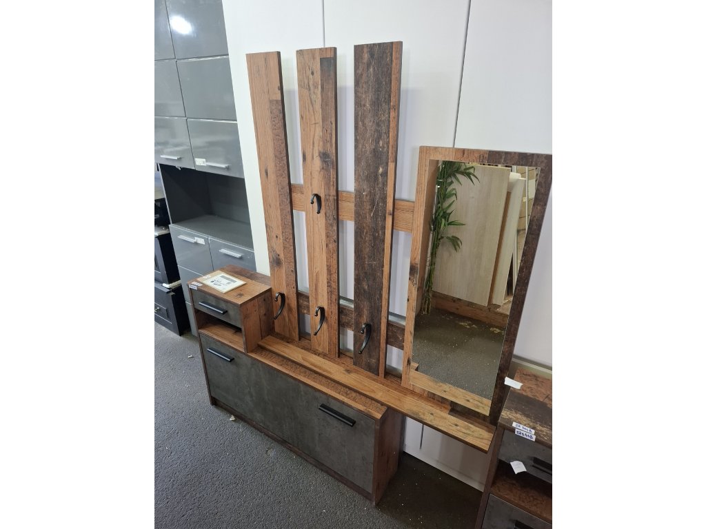 Předsíňová sestava Varbla, art. č.1000264030. Materiál: potažená dřevotříska/zrcadlové sklo/plast (rukojeti). Barva: dekor recyklovaného dřeva/ dekor beton/ černá. Rozměry: 98 x 28 x 180 cm (ŠxHxV). Váha cca 28 kg. Nosnost max. 20 kg. Vnitřní rozměry zásuvek: 27,4 x 19,8 cm (Š x H). Poskytuje prostor až pro 6 párů bot. Prodáváme tak, jak vidíte na obrázcích. Případné doplňky a úvodní obrázek je pouze pro ilustraci.