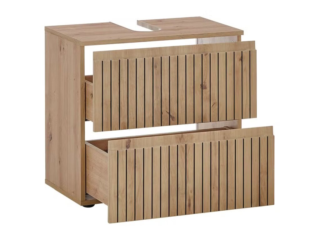 Skříňka pod umyvadlo Rookerie, art. č. 1000418627. Materiál :Přední strana: MDF, fóliovaná a potažená/Korpus: HDF potažená fólií. Barva: dekor dub. Rozměry: 60 x 35 x 56 cm (ŠxHxV). Váha 19,5 kg. Nosnost polic 3 kg. Výřez pro sifon (BT)10,2 x 25 cm. Prodáváme tak, jak vidíte na obrázcích. Případné doplňky a úvodní obrázek je pouze pro ilustraci. Odstín na fotografiích se může od skutečné barvy nepatrně lišit.