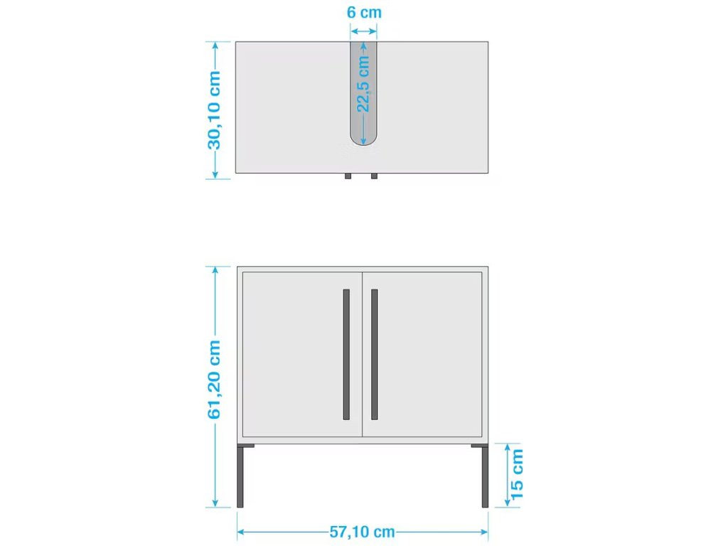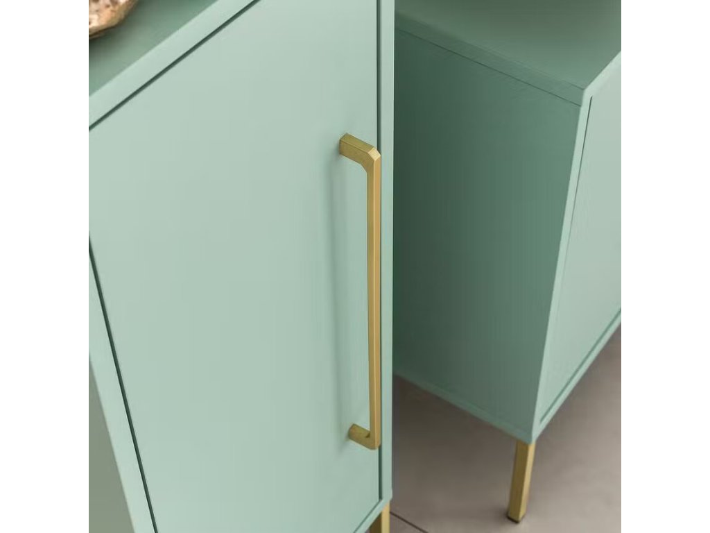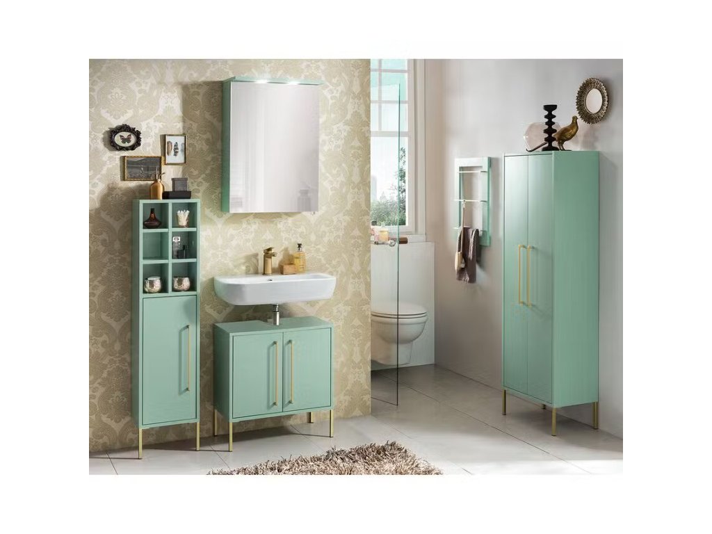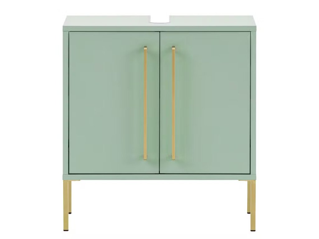 Skříňka pod umyvadlo Sarah, art. č. 1000208510. Materiál: dřevotříska s povrchovou úpravou/železo. Barva: mátová/zlatá. Rozměry: 57 x 30 x 61 cm (ŠxHxV). Váha 11 kg. Nohy se dají sundat, bez polic. Prodáváme tak, jak vidíte na obrázcích. Případné doplňky a úvodní obrázek jsou pouze pro ilustraci. Odstín na fotografiích se může od skutečné barvy nepatrně lišit.