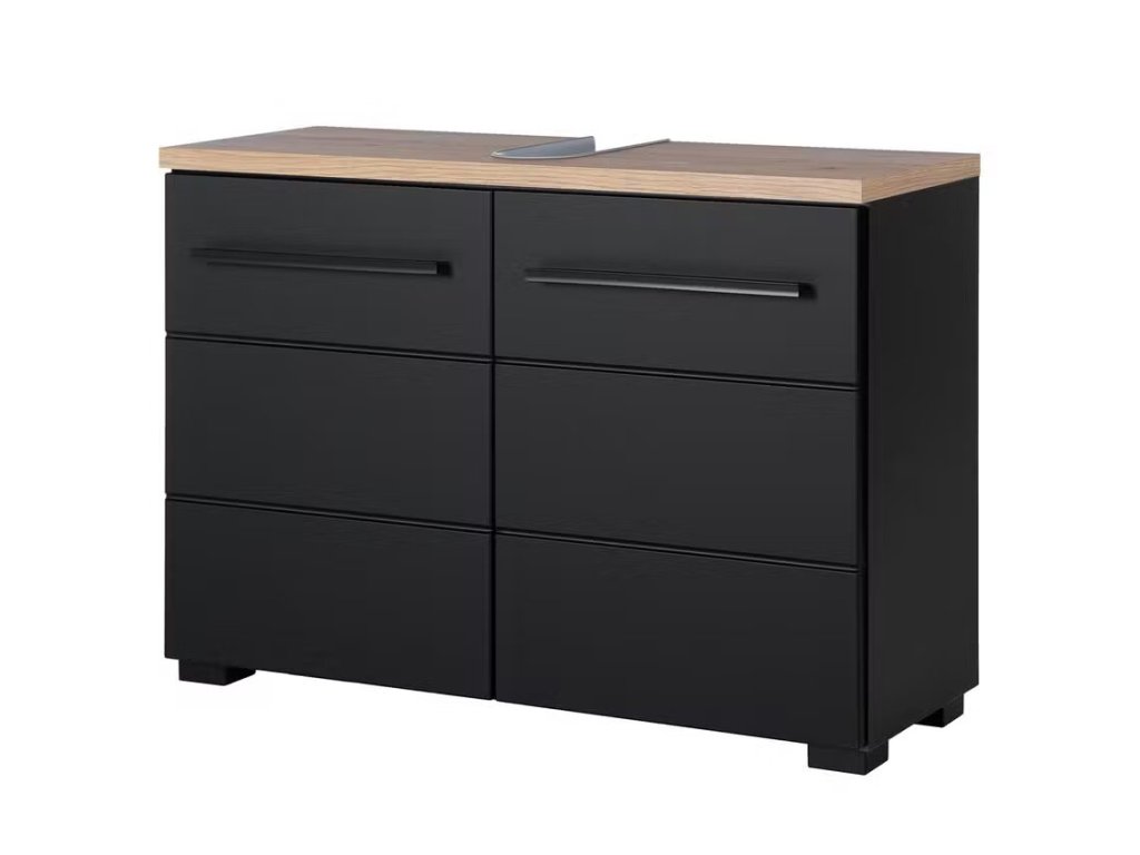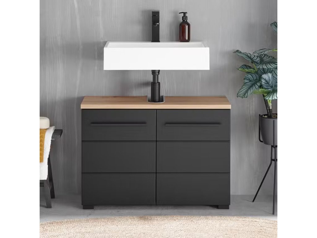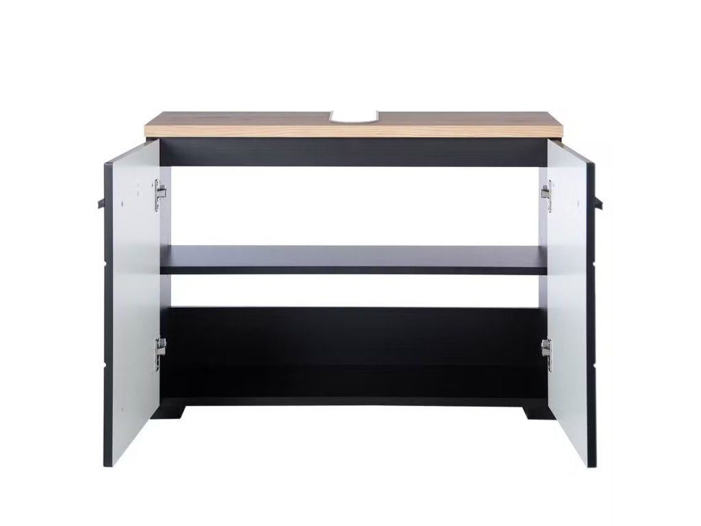 Skříňka pod umyvadlo Wyntoon, art. č. 1000311847. Materiál: přední strana MDF s fóliovou úpravou, tělo je dřevotřísková deska, potažená fólií. Barva: dekor dubu Artisa/matná černá. Rozměry: 80 x 31 x 57 cm (ŠxHxV). Váha 21 kg. Má odnímatelné nohy. Prodáváme tak, jak vidíte na obrázcích. Případné doplňky a úvodní obrázek jsou pouze pro ilustraci. Odstín na fotografiích se může od skutečné barvy nepatrně lišit.